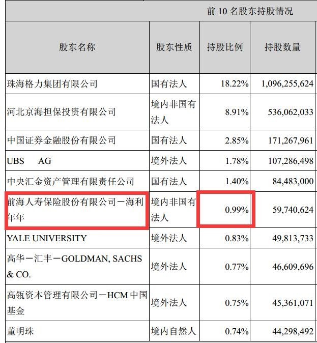 2016年的中报就显示,宝能系的前海人寿“海利年年保险产品”持有9010.29万股格力电器,占格力电器总股本1.50%,位列第四大流通股东。