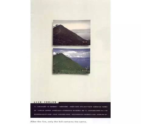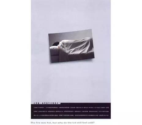 另一个就是,李少蕙第一次以创作总监的身份得奖的作品,它是为孩子们募捐的公益广告。大概九六年的时候,香港发生山火,登山远足的孩子们都烧伤了,李少蕙听电台广播这些孩子家里经济状况都不怎么样,很想为他们做些事情。李少蕙也拿了很多伤者的照片和朋友们聊企划。朋友说你怎么可以用这些照片,手烧破了,脸烂了,你不能拿这个做海报让别人捐钱。他们都不忍心看,把照片反过来背面朝上。恰恰是朋友的这个举动给李少蕙带来了灵感,李少蕙也称自己为那稿子流了眼泪,而这个作品也为她拿了时报年度最佳平面金奖。