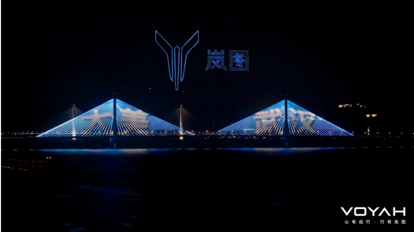 长江沿岸的500座建筑楼体灯光视频秀、1000多架无人机,配合发布会,呈现了岚图品牌LOGO、愿景,与场内的发布主题辉映,实现了他“天帷幕、长江为台”的大构想。