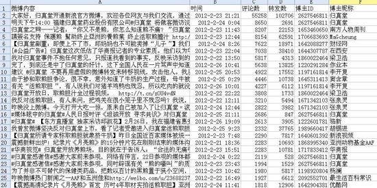根据我们的数据分析,和归真堂的有关的字词微博的一个突出特点是有不少转发上千或几千,但评论接近于0的营销水军微博 ,这说明网络水军的软件自动转发功能已经过关,但是自动评论功能还有不少缺陷。