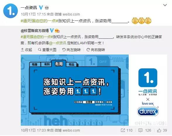 除了自身传播之外,此次品推还与一百多家品牌进行了联合推广,百余家品牌官微也玩起了自己创意的一点打码体广告,引爆话题。能够调动多家品牌参与其中,最重要的原因是,一点资讯把有趣做成了一个基础,在提供有料、有用、有品的差异性定位的基础上,有趣是一切的前提,包括营销本身。一点资讯将“有趣、有料、有用、有品”四有品牌理念完整灌输进了广告文案,每一个不同的答案都代表了不同的兴趣点。此外,一点资讯还策划了一系列活动,在未来这几周都会陆续上线。