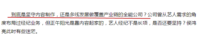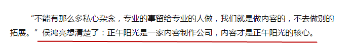 经历了网上的几番风波,2017年正午阳光正式舍弃掉了多线的商业业务,专注内容制作。侯鸿亮在接受媒体采访中,内容上的成功后,各种资源迅速涌入,他也曾很困惑,到底是坚持内容还是多线发展做覆盖产业链的全能公司?
