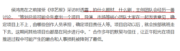 侯鸿亮此前在接受媒体的采访中表示,拍什么素材,什么剧,主创团队会经历一番讨论,策划总监会先拿出一个项目,导演、市场等核心团队在一起发表意思。