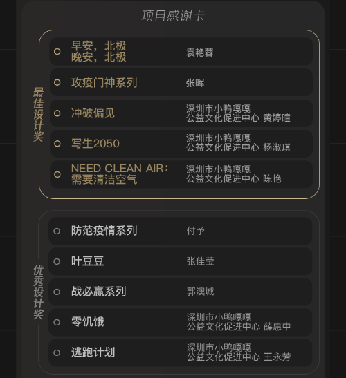 而赛道组别的细分让参赛者以最适合自己的方式“创益”,也为参赛者提供了更丰富的“创益”选择与更广阔的施展平台。本届创益科技组的参赛团队将科技赋能的运用再升级,更加深入有效的运用技术的力量,让创意的呈现更加生动;创益原力组更关注于以深入洞察和故事撬动爱心,用真实与别出心裁的讲述打动人心;创益品牌组聚焦在进一步将品牌力量与向善之心更有机的结合,创造更大的社会影响力;新增赛道创益设计组则以更多元的视觉与互动展现,让微小善意都能被看见,这也是大赛引入新主办方CDC的初衷——在探索公益项目深度的同时,拓宽公益实现的广度。腾讯CDC设计专家、腾讯公益首席设计师刘彦良表示:“我们不仅是自身投入到公益中,更希望能号召更多的人通过设计的力量来改变社会,这和用创意改变世界的‘我是创益人’特别契合,也是‘创益设计组’这个新赛道设立的初衷,我们希望能够支持更多人通过设计的力量为公益发声,我们也尽自己的绵薄之力,让更多人的创意能被看见。”