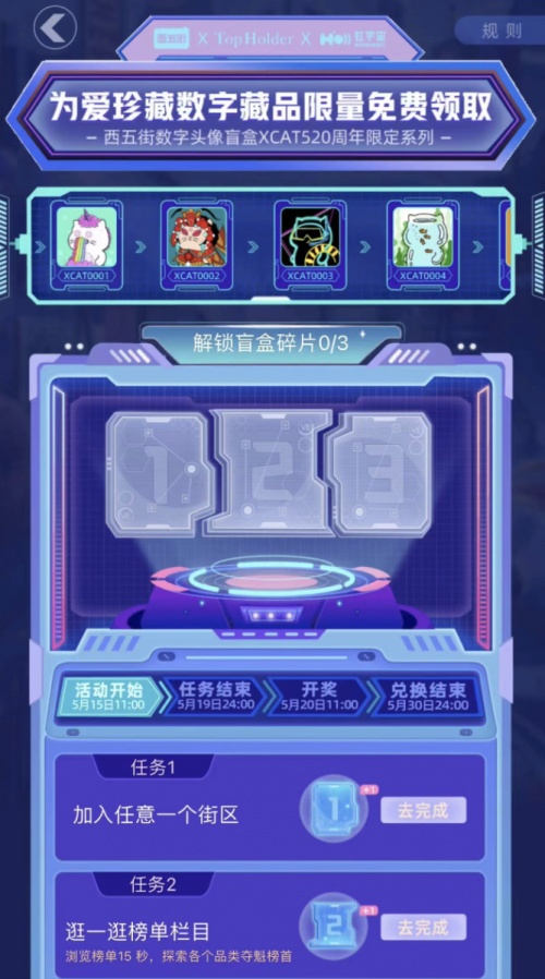 参与者在5月15日11:00-5月19日24:00登录西五街APP通过加入任意一个街区、浏览榜单15秒、邀请两位好友助力等任务,成功解锁3个盲盒碎片,即可在5月20日规定时间内兑换数字藏品头像。每一个头像都有唯一的编号,具有收藏价值。数字艺术头像所有权归领取者即藏品权利人所有,可以用于收藏、观赏,并以此更换成西五街APP头像。但不具备支付、交易等任何货币或金融属性。