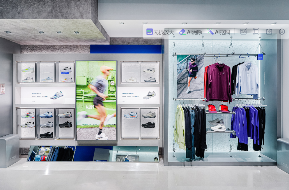 延续品牌一贯的专业主义基因,店内陈列围绕不同跑步需求清晰划分,覆盖日常训练、竞速比赛及越野等场景,并同步呈现完整的跑步服饰、运动内衣与配饰系列,为城市跑者提供系统、高效的一站式装备体验。在高度概念化的空间之中,BROOKS始终坚持以真实跑步需求为核心,让设计服务于跑者本身。